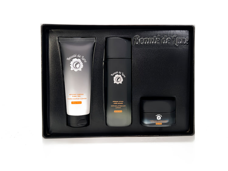 This set includes a full-size Beauté de Lune for men AHA/BHA Complex Cleanser, which supports skin’s natural moisture reserves for up to a full 24 hours. Defense Aftershave Lotion delivers a deep pore clean in the form of a soothing, non-drying lather. Oil Control Daily Moisturizer is rich in moisture. Combined, these three products are the perfect addition to your daily routine for skin that feels smooth and comfortable.